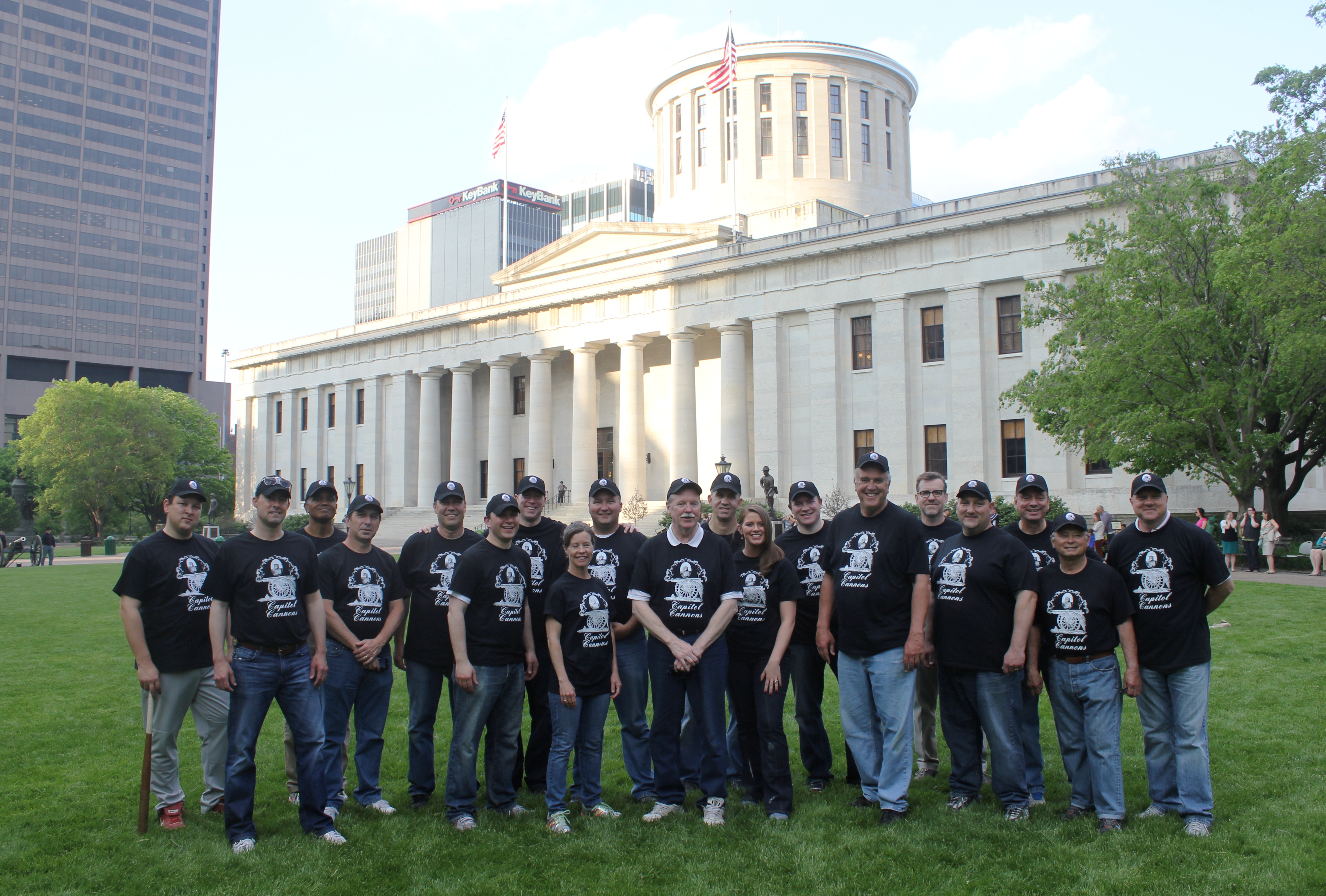 Members of the 130th Ohio General Assembly played a base ball game against the Ohio Village Muffins, Tuesday, May 20. The 2014 "Capitol Cannons" were skippered by Clay Hall, sports director for ABC6/FOX28. The event featured cannon firings by 1st Ohio Light Artillery, Battery A, a display of historic base ball memorabelia by Tracy Martin, Lincoln portrayed by Robert Brugler and the national anthem sung by the Ohio Village Singers. Concessions will be provided by the Capitol Cafe, operated by Milo’s Catering and Banquet Services.