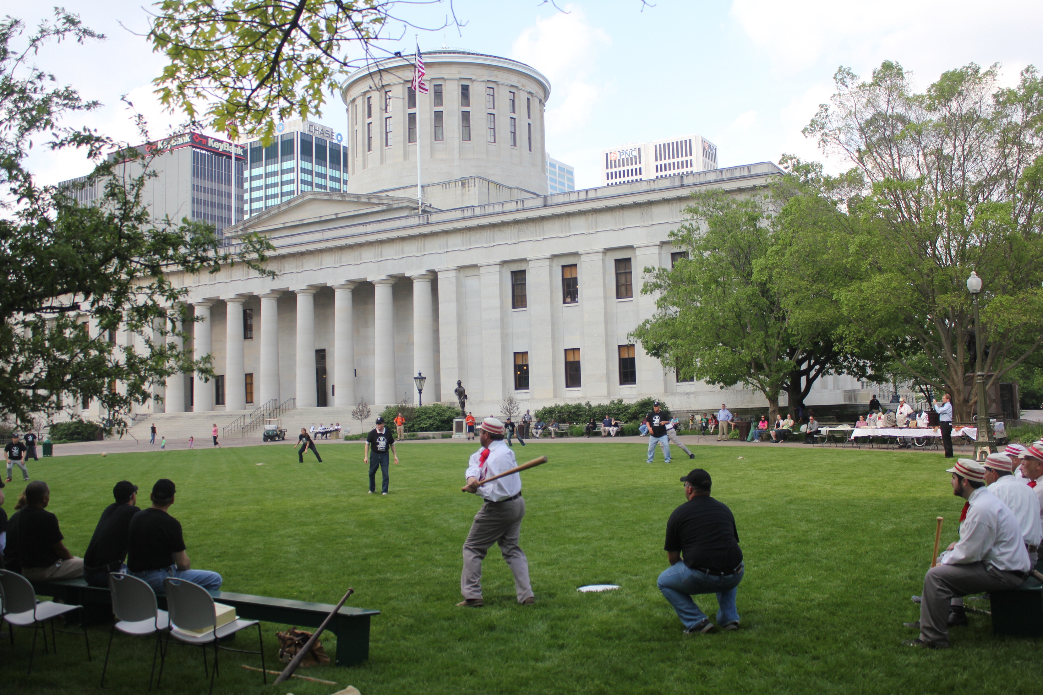 Members of the 130th Ohio General Assembly played a base ball game against the Ohio Village Muffins, Tuesday, May 20. The 2014 "Capitol Cannons" were skippered by Clay Hall, sports director for ABC6/FOX28. The event featured cannon firings by 1st Ohio Light Artillery, Battery A, a display of historic base ball memorabelia by Tracy Martin, Lincoln portrayed by Robert Brugler and the national anthem sung by the Ohio Village Singers. Concessions will be provided by the Capitol Cafe, operated by Milo’s Catering and Banquet Services.