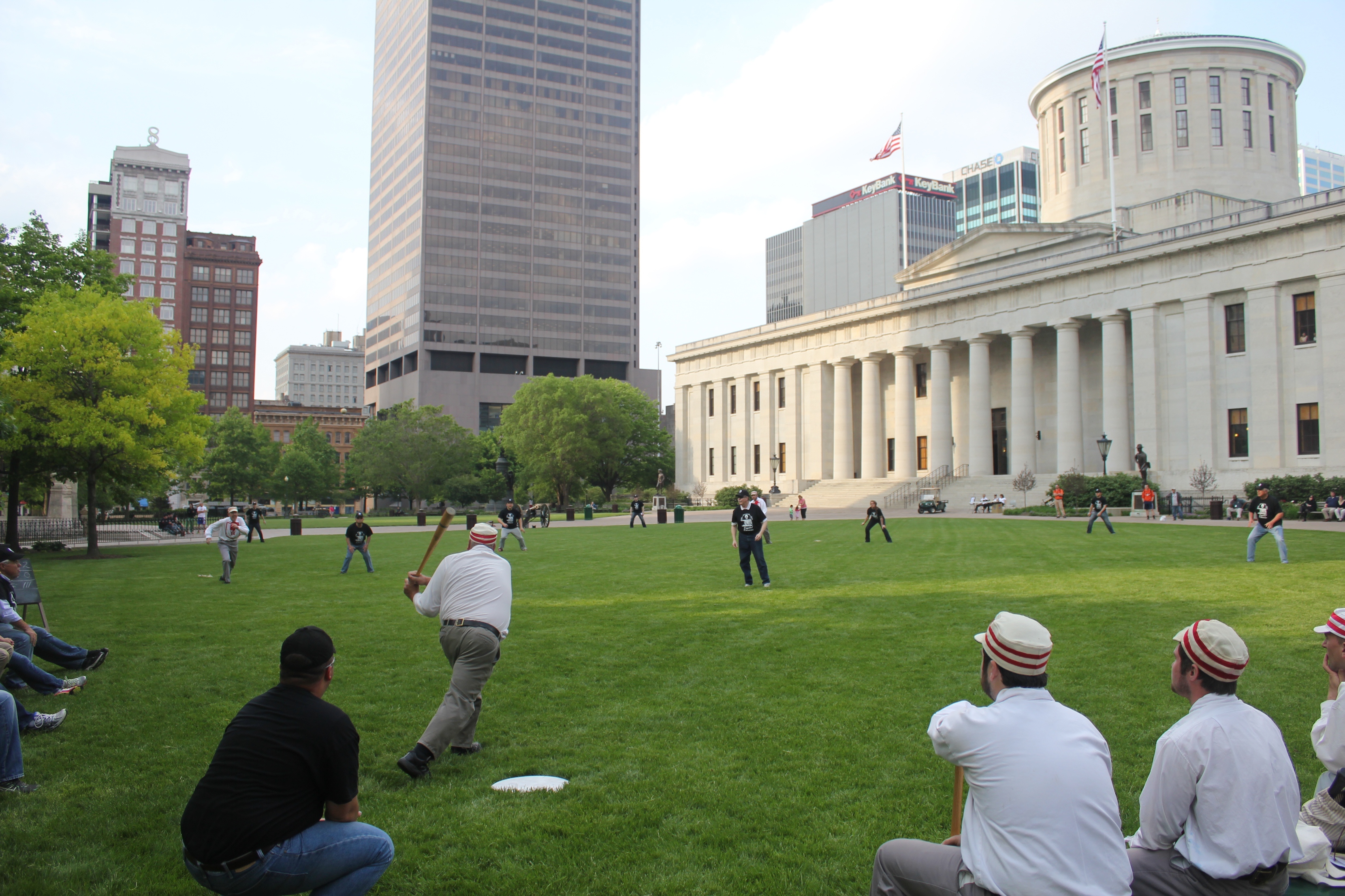 Members of the 130th Ohio General Assembly played a base ball game against the Ohio Village Muffins, Tuesday, May 20. The 2014 "Capitol Cannons" were skippered by Clay Hall, sports director for ABC6/FOX28. The event featured cannon firings by 1st Ohio Light Artillery, Battery A, a display of historic base ball memorabelia by Tracy Martin, Lincoln portrayed by Robert Brugler and the national anthem sung by the Ohio Village Singers. Concessions will be provided by the Capitol Cafe, operated by Milo’s Catering and Banquet Services.