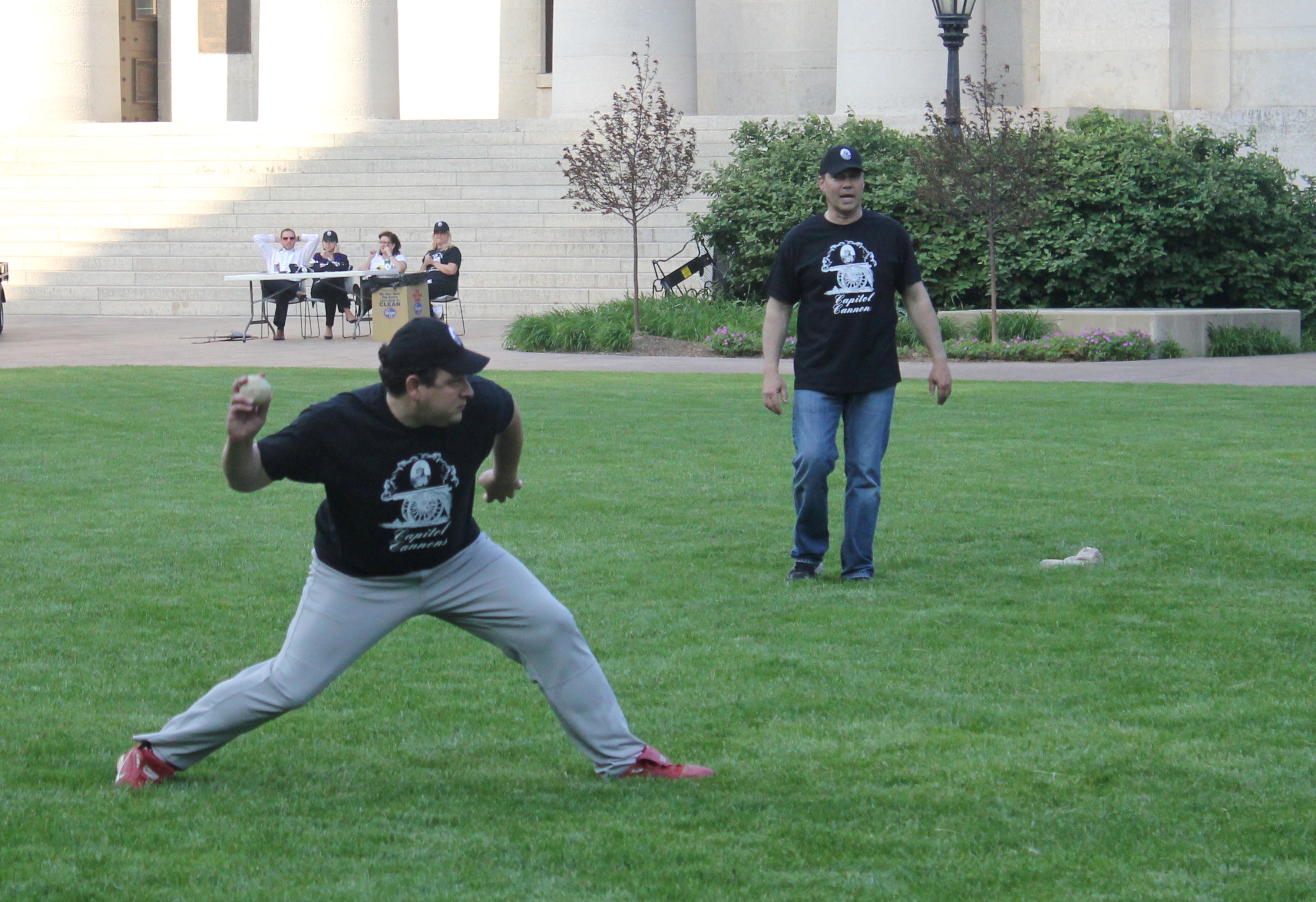 Members of the 130th Ohio General Assembly played a base ball game against the Ohio Village Muffins, Tuesday, May 20. The 2014 "Capitol Cannons" were skippered by Clay Hall, sports director for ABC6/FOX28. The event featured cannon firings by 1st Ohio Light Artillery, Battery A, a display of historic base ball memorabelia by Tracy Martin, Lincoln portrayed by Robert Brugler and the national anthem sung by the Ohio Village Singers. Concessions will be provided by the Capitol Cafe, operated by Milo’s Catering and Banquet Services.