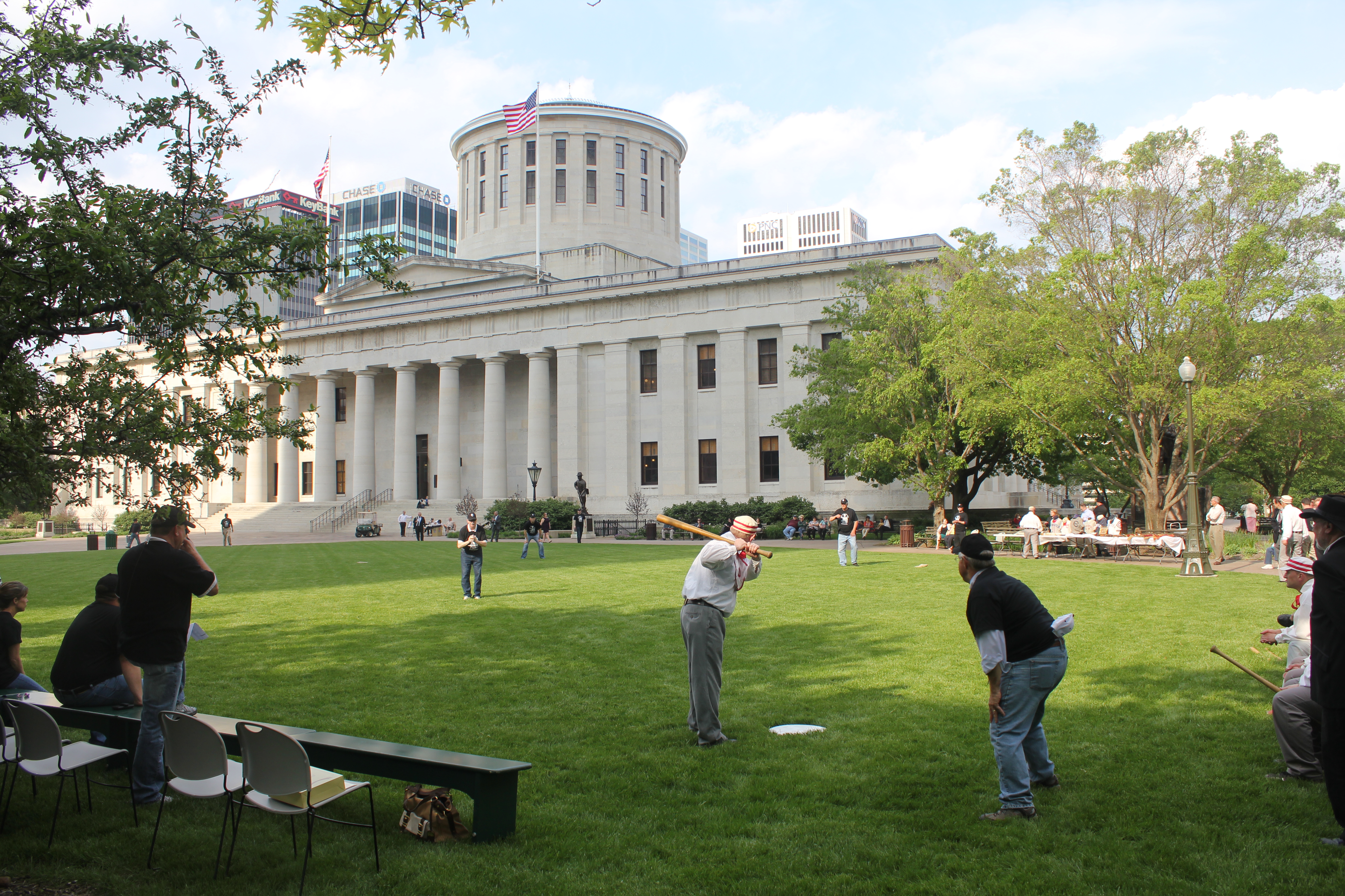 Members of the 130th Ohio General Assembly played a base ball game against the Ohio Village Muffins, Tuesday, May 20. The 2014 "Capitol Cannons" were skippered by Clay Hall, sports director for ABC6/FOX28. The event featured cannon firings by 1st Ohio Light Artillery, Battery A, a display of historic base ball memorabelia by Tracy Martin, Lincoln portrayed by Robert Brugler and the national anthem sung by the Ohio Village Singers. Concessions will be provided by the Capitol Cafe, operated by Milo’s Catering and Banquet Services.