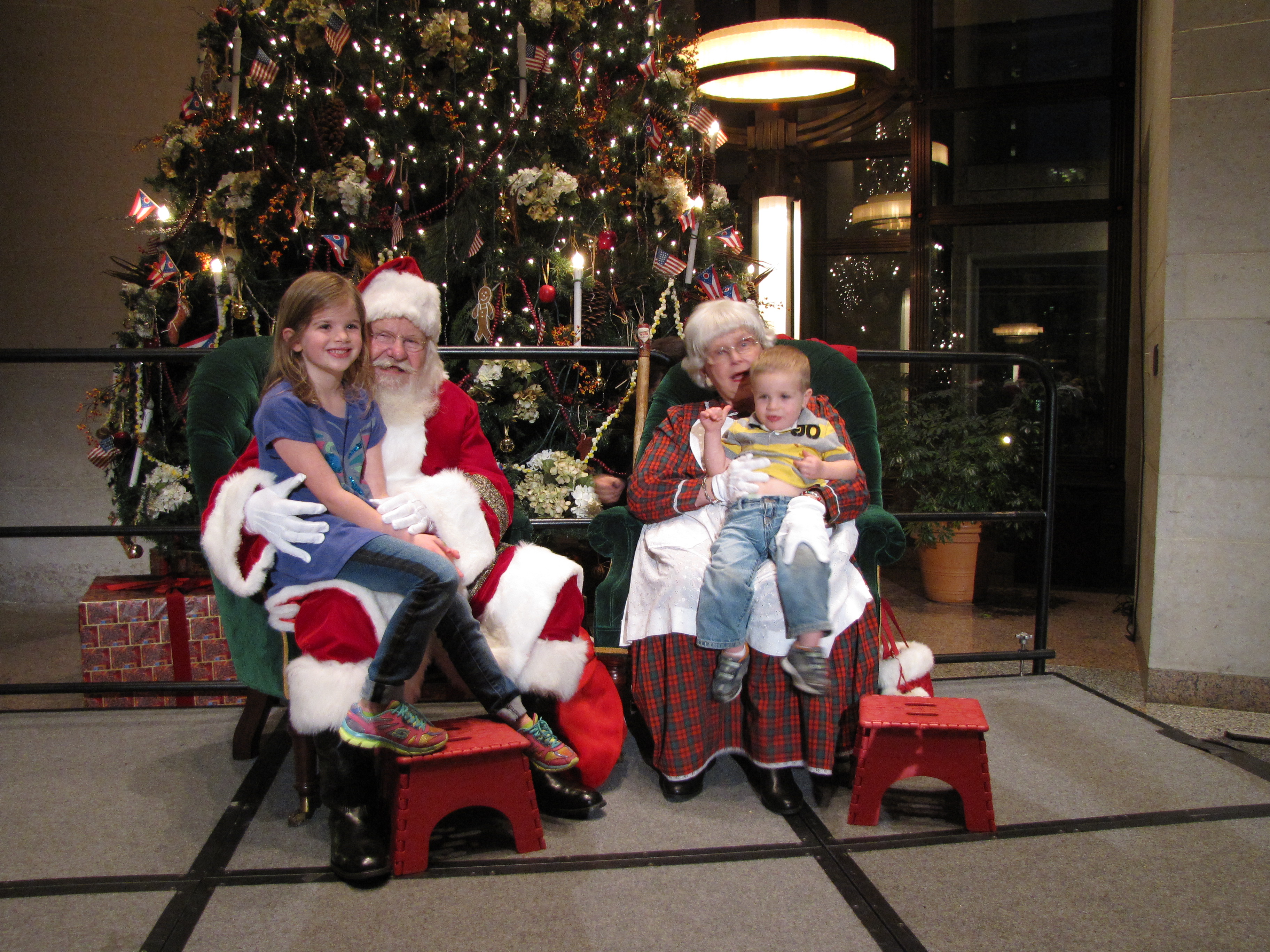The Ohio Statehouse Holiday Festival and Tree Lighting on Dec. 3, 2013 featured bright lights, community mascots, music, and many activities for kids. Neighbor businesses donated food and drink. Free pictures with Santa and Mrs. Claus are posted on the Statehouse Web site. Click on the picture several times for the highest resolution file. Right click to download your souvenir. Happy Holidays!