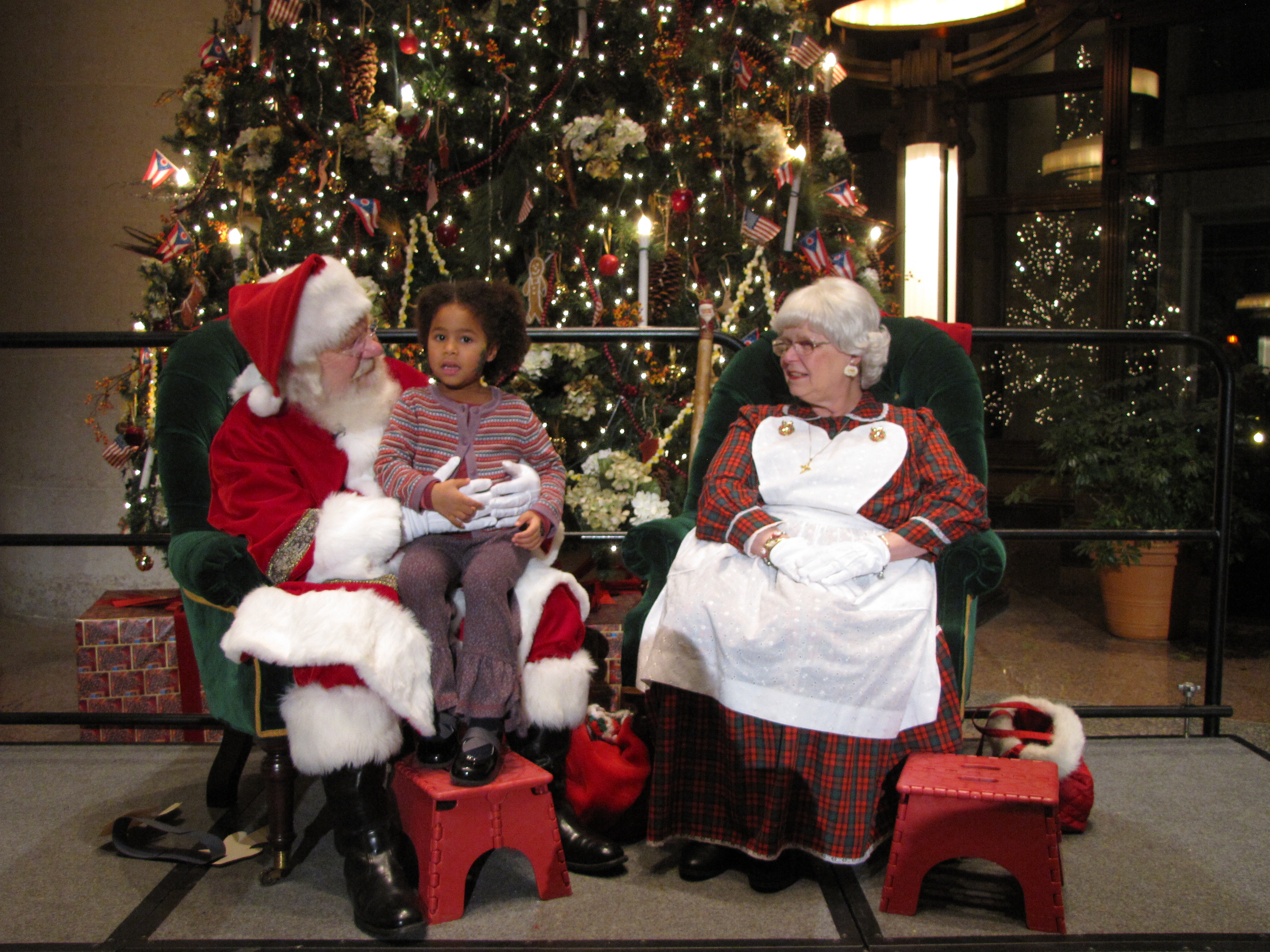 The Ohio Statehouse Holiday Festival and Tree Lighting on Dec. 3, 2013 featured bright lights, community mascots, music, and many activities for kids. Neighbor businesses donated food and drink. Free pictures with Santa and Mrs. Claus are posted on the Statehouse Web site. Click on the picture several times for the highest resolution file. Right click to download your souvenir. Happy Holidays!