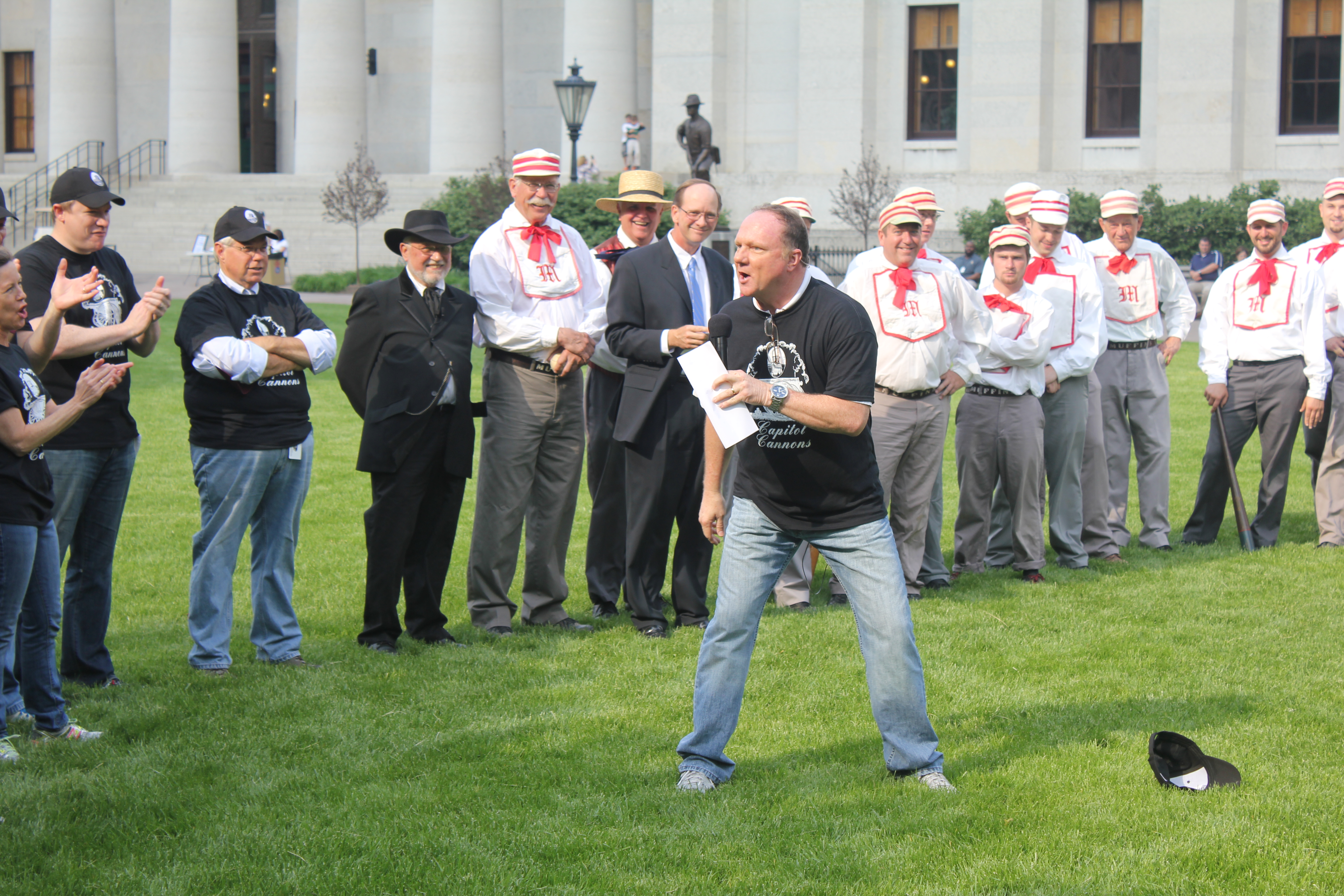 Members of the 130th Ohio General Assembly played a base ball game against the Ohio Village Muffins, Tuesday, May 20. The 2014 "Capitol Cannons" were skippered by Clay Hall, sports director for ABC6/FOX28. The event featured cannon firings by 1st Ohio Light Artillery, Battery A, a display of historic base ball memorabelia by Tracy Martin, Lincoln portrayed by Robert Brugler and the national anthem sung by the Ohio Village Singers. Concessions will be provided by the Capitol Cafe, operated by Milo’s Catering and Banquet Services.