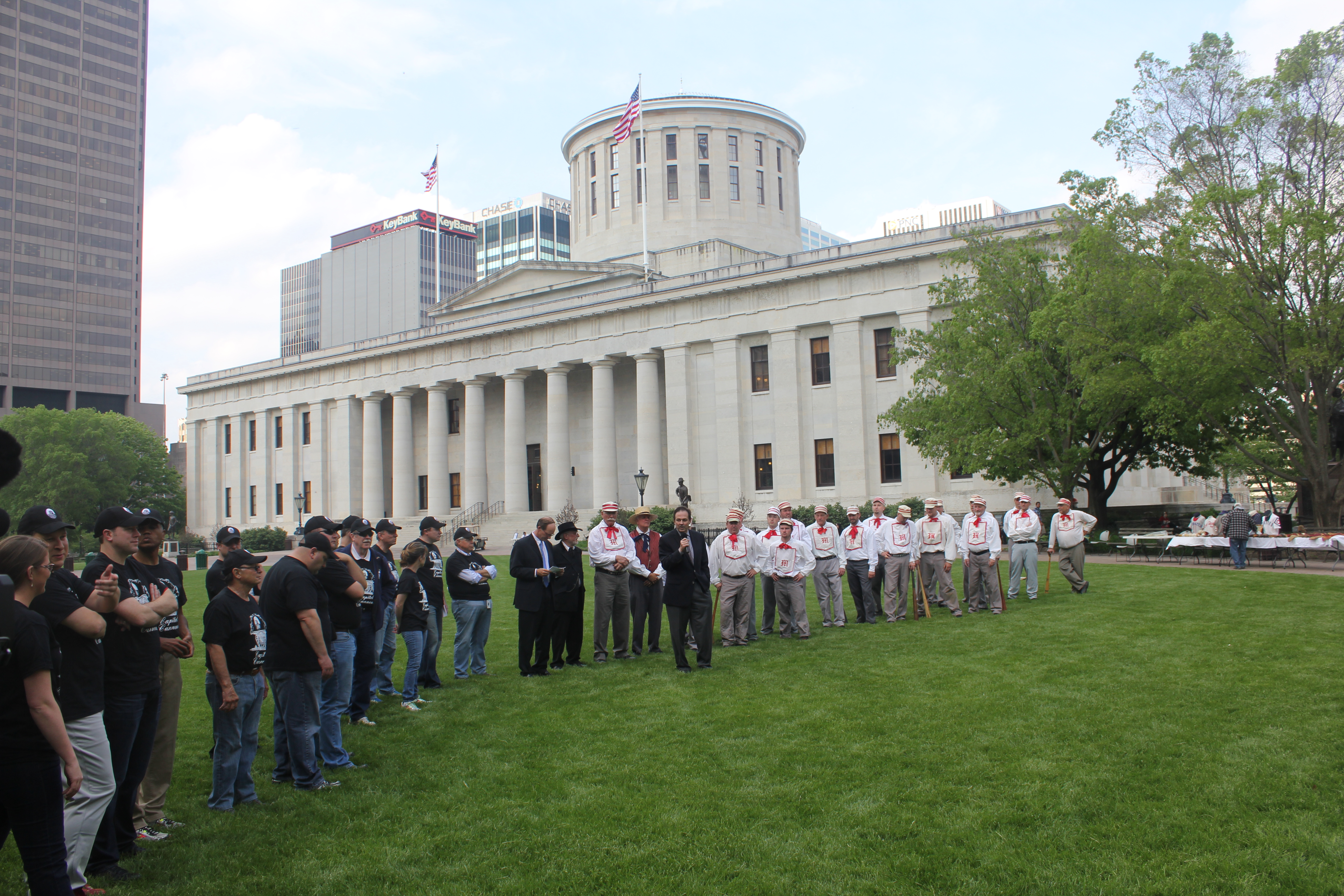 Members of the 130th Ohio General Assembly played a base ball game against the Ohio Village Muffins, Tuesday, May 20. The 2014 "Capitol Cannons" were skippered by Clay Hall, sports director for ABC6/FOX28. The event featured cannon firings by 1st Ohio Light Artillery, Battery A, a display of historic base ball memorabelia by Tracy Martin, Lincoln portrayed by Robert Brugler and the national anthem sung by the Ohio Village Singers. Concessions will be provided by the Capitol Cafe, operated by Milo’s Catering and Banquet Services.