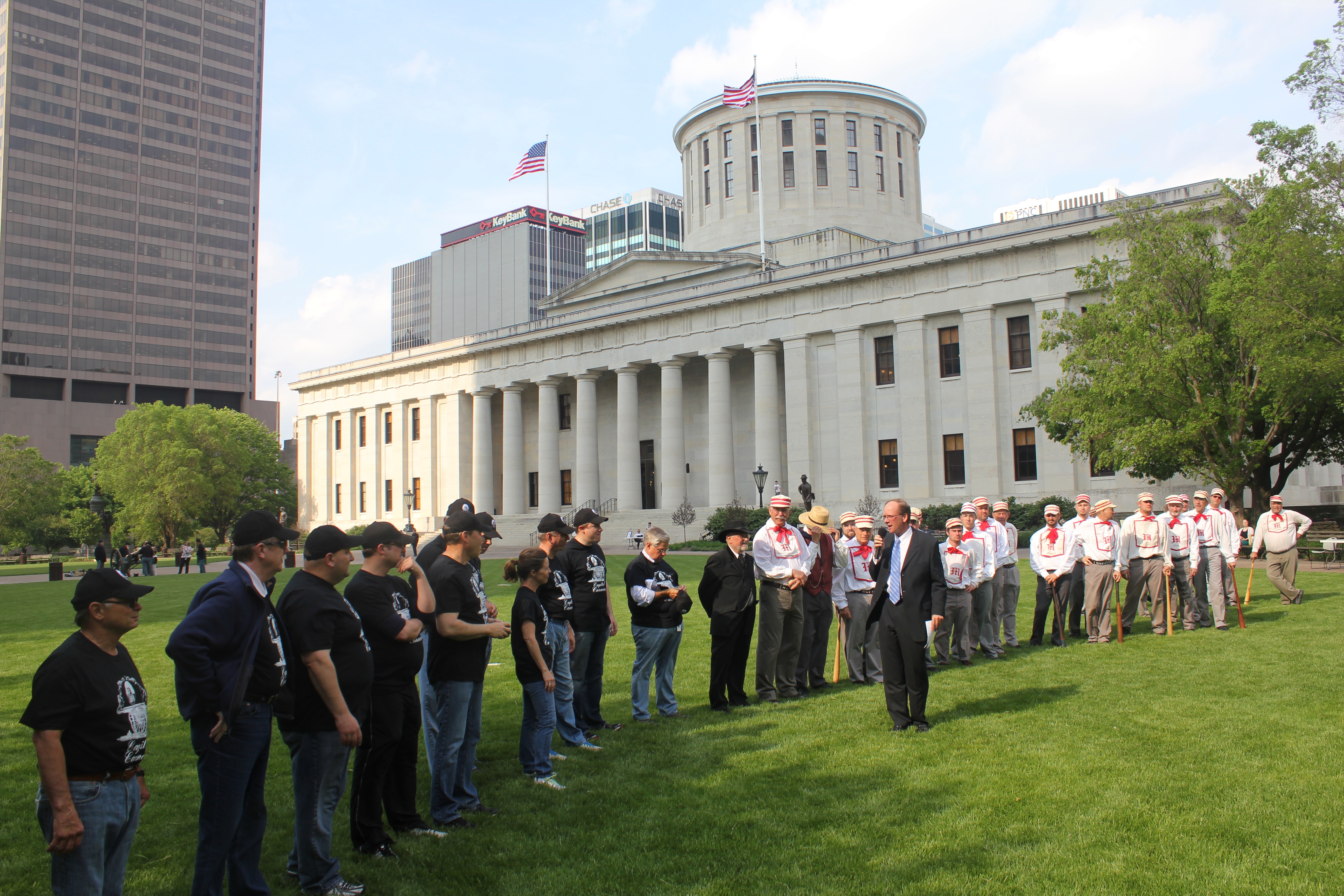 Members of the 130th Ohio General Assembly played a base ball game against the Ohio Village Muffins, Tuesday, May 20. The 2014 "Capitol Cannons" were skippered by Clay Hall, sports director for ABC6/FOX28. The event featured cannon firings by 1st Ohio Light Artillery, Battery A, a display of historic base ball memorabelia by Tracy Martin, Lincoln portrayed by Robert Brugler and the national anthem sung by the Ohio Village Singers. Concessions will be provided by the Capitol Cafe, operated by Milo’s Catering and Banquet Services.