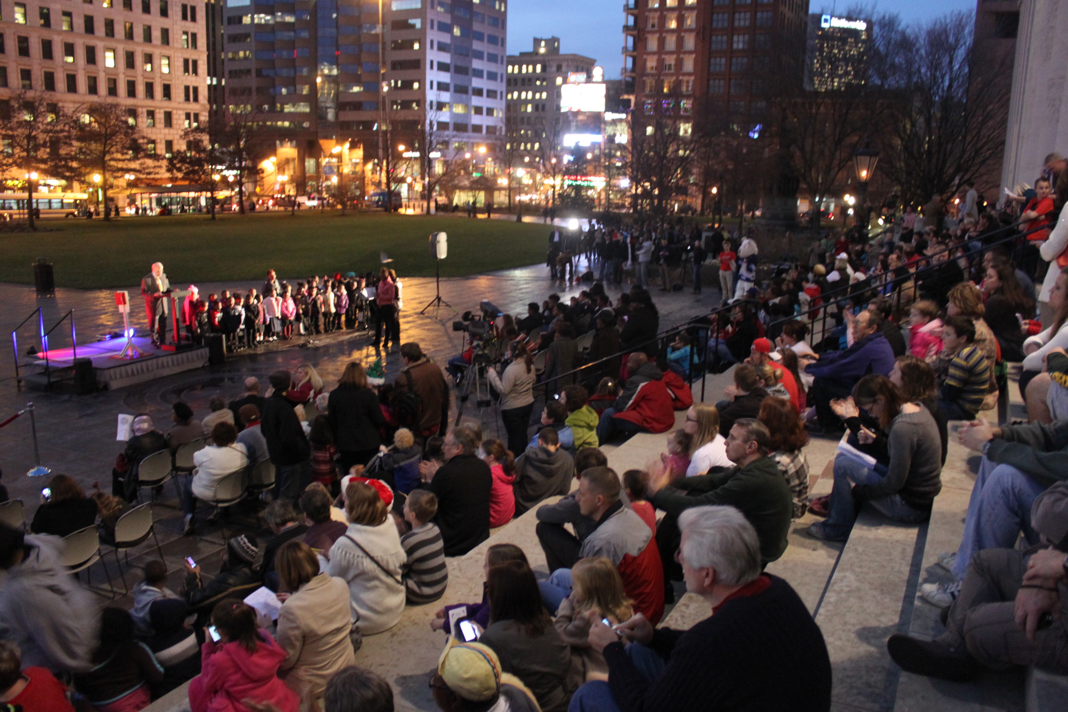 The 2012 Ohio Statehouse Tree Lighting and Holiday Festival on Dec. 3, included a welcome by Sen. Richard Finan, entertainment by Ohio musicians, mascots and performers, refreshments by Tim Hortons and caterers, a visit from Santa and Mrs. Claus, and the generous help from many, many volunteers. Video can be seen here -- http://www.OhioChannel.org/MediaLibrary/Media.aspx?fileId=134216