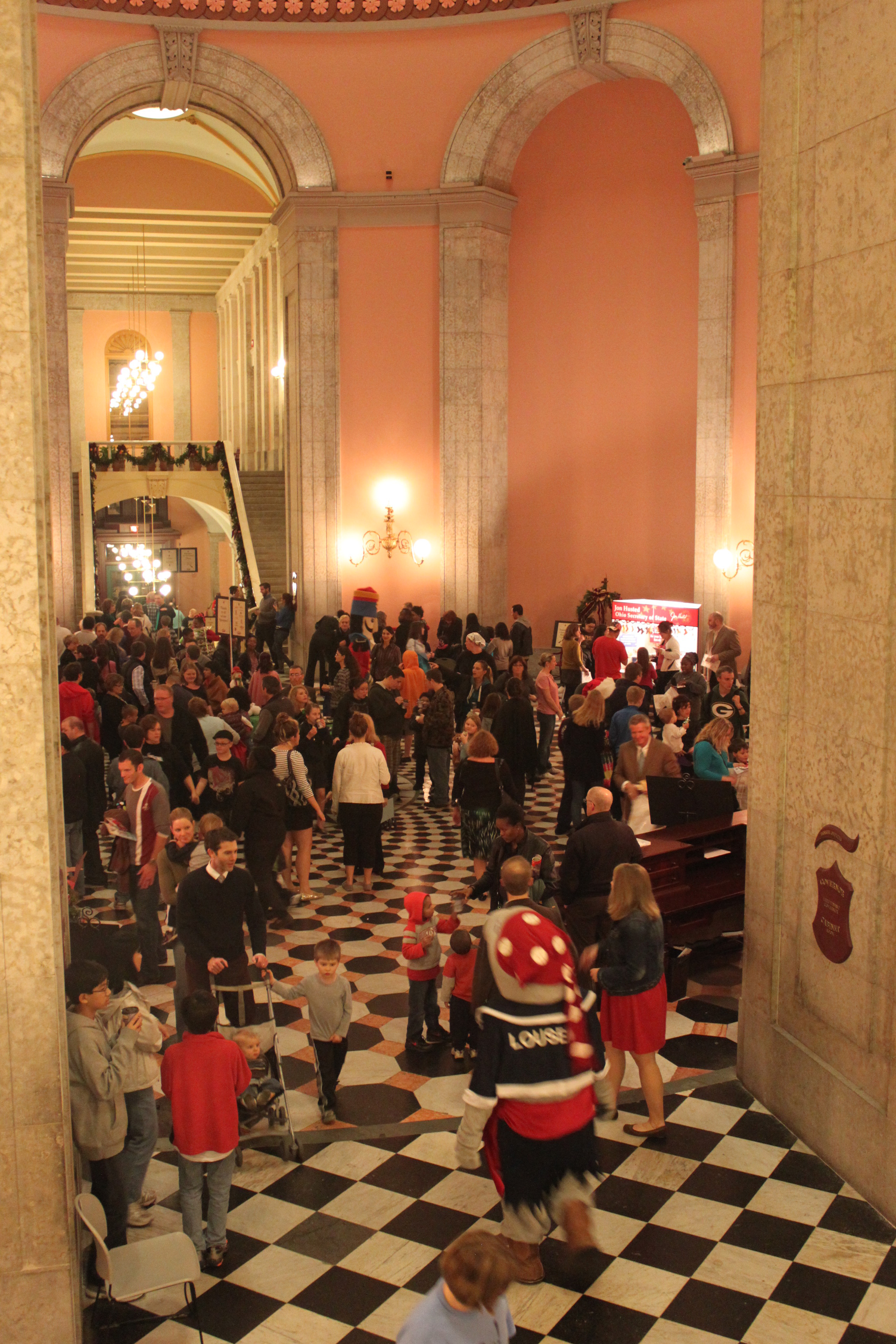 The 2012 Ohio Statehouse Tree Lighting and Holiday Festival on Dec. 3, included a welcome by Sen. Richard Finan, entertainment by Ohio musicians, mascots and performers, refreshments by Tim Hortons and caterers, a visit from Santa and Mrs. Claus, and the generous help from many, many volunteers. Video can be seen here -- http://www.OhioChannel.org/MediaLibrary/Media.aspx?fileId=134216