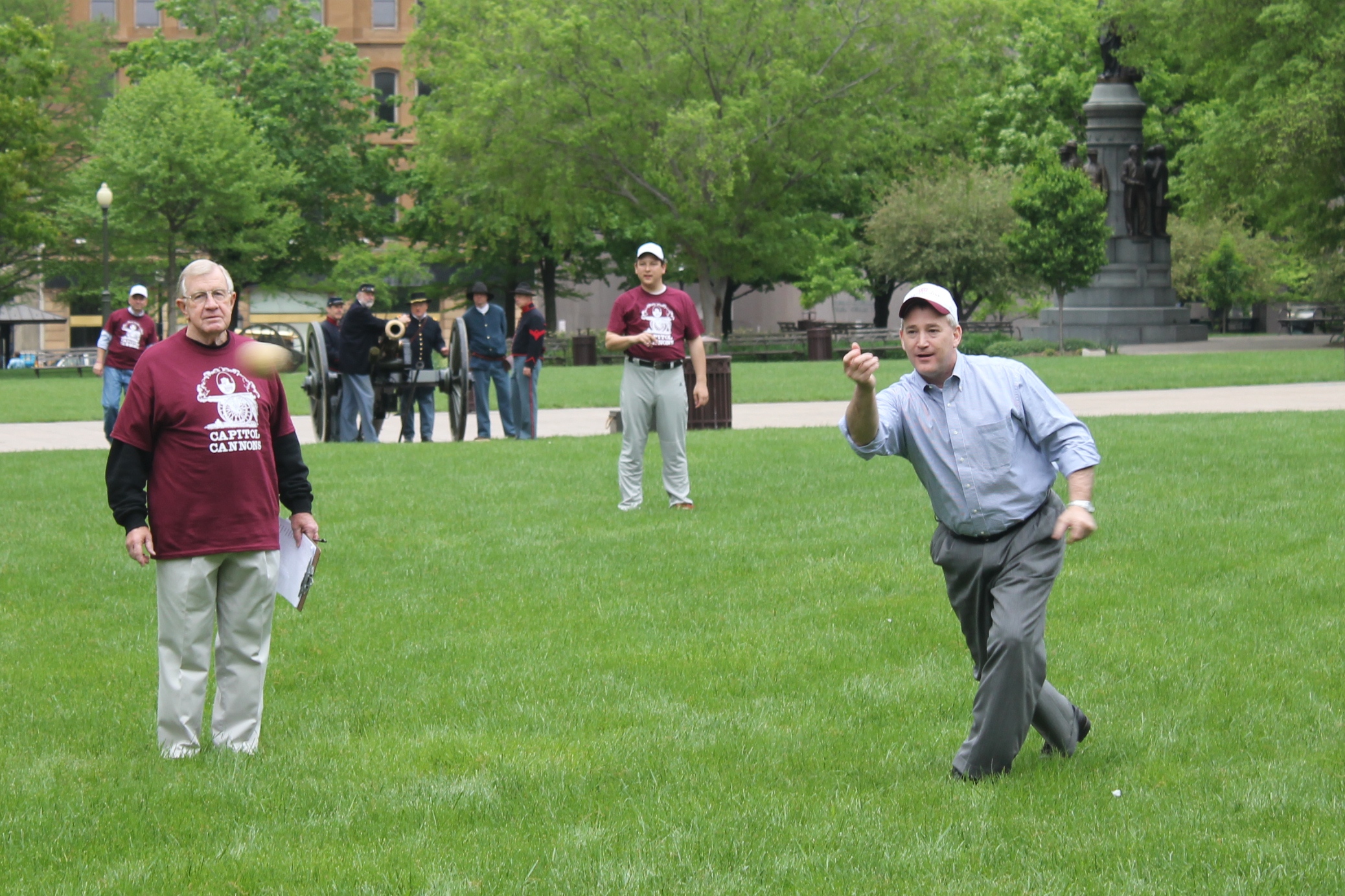 A vintage base ball game was played on May 7, 2013 at the Ohio Statehouse. The Ohio Village Muffins played the Capitol Cannons, members of the Ohio General Assembly. The event was sponsored by the Ohio Lobbying Association.