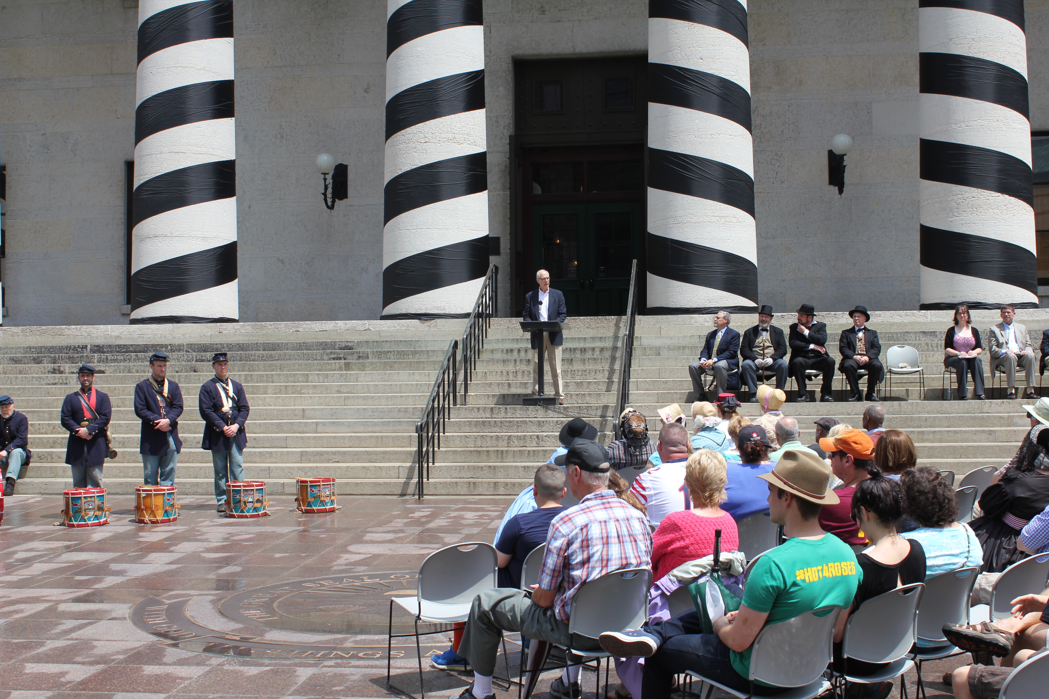 Ohio Civil War 150 Mustering Out and Concluding Ceremony -- Burt Logan, Ohio History Connection. The concluding Ohio event of the 150th anniversary of the Civil War was held Sunday, May 17 at 2 p.m. on the front steps of the Ohio Statehouse. It was a special recreation of events held there in the spring of 1865. Thanks to the Ohio Civil War 150 Advisory Committee, Ohio History Connection and the Army of the Ohio Reenactors. Rep. Stephen Hambley dressed as historical Sen. John Sherman and gave his speech. An 1864 bronze cannon was fired by 1st Ohio Light Artillery, Battery A. Music was provided by Camp Chase Fife and Drum.