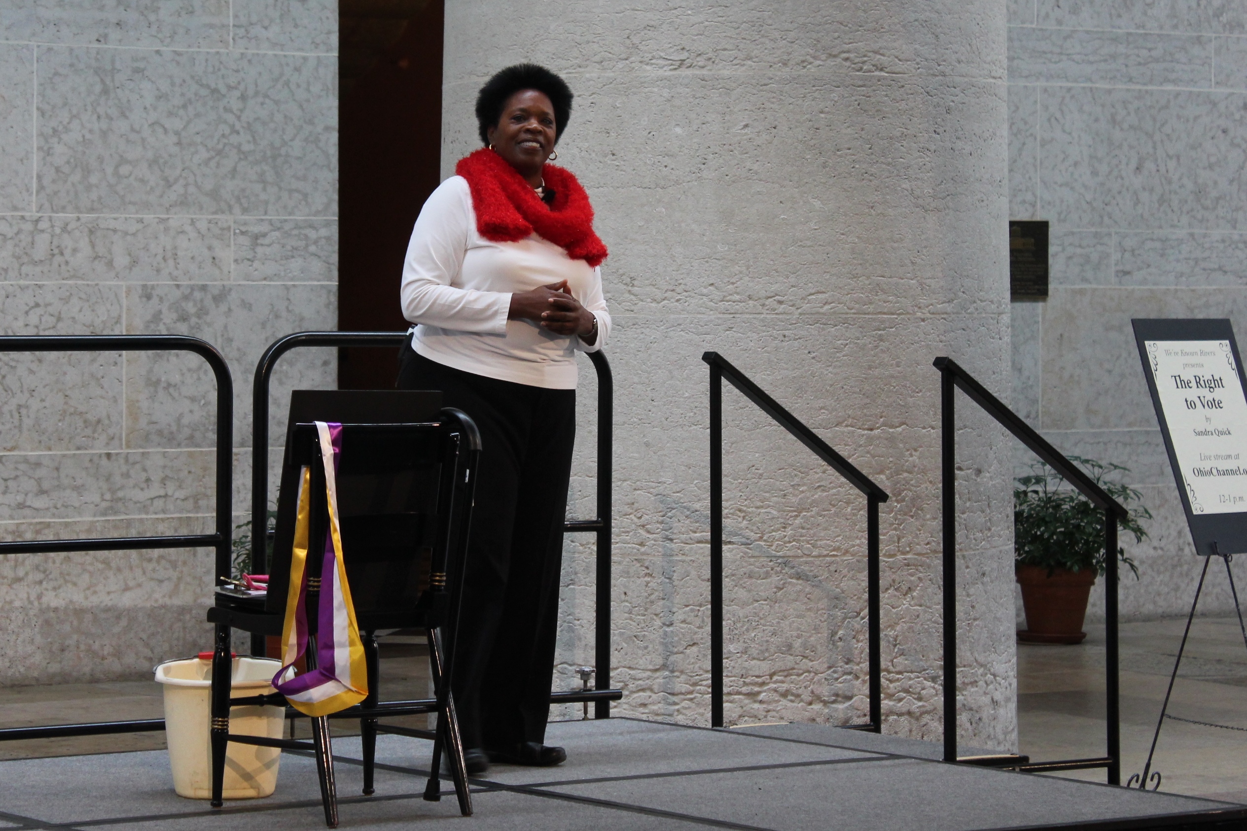 Black History Month 2016 at the Ohio Statehouse included living history programs by We've Known Rivers. The Right To Vote was presented by Sandra Quick, Feb. 16, 2016 in the Atrium. Sandra Quick is the author of Our History Awakens: Creating My Living History Avatar.