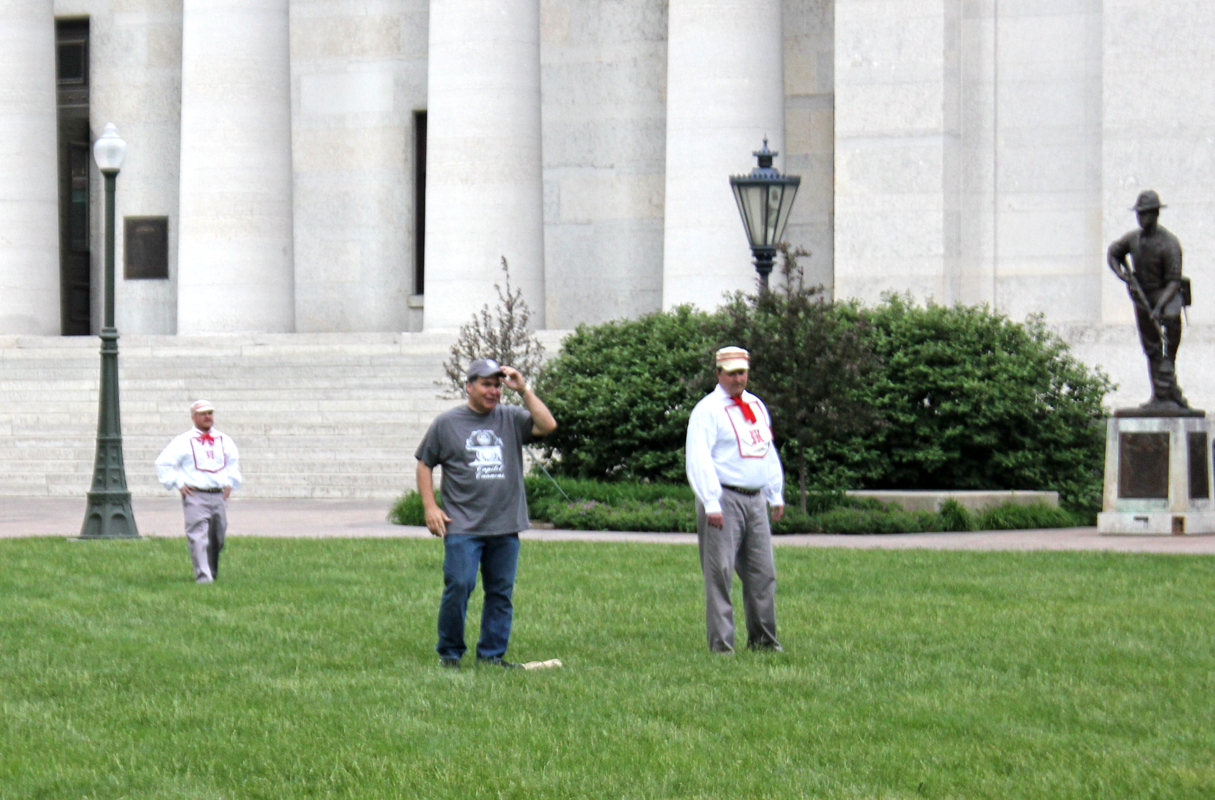 The legislators of the Ohio General Assembly formed a team, the Capitol Cannons, and played a vintage base ball (originally two words) with the Ohio Village Muffins on the front lawn of the Ohio Statehouse. They used the 19th century rules, and had a fun time. The final score was: Muffins-11, Cannons-2. The Muffins retained the Richard Schuricht Memorial Cup for another year.
