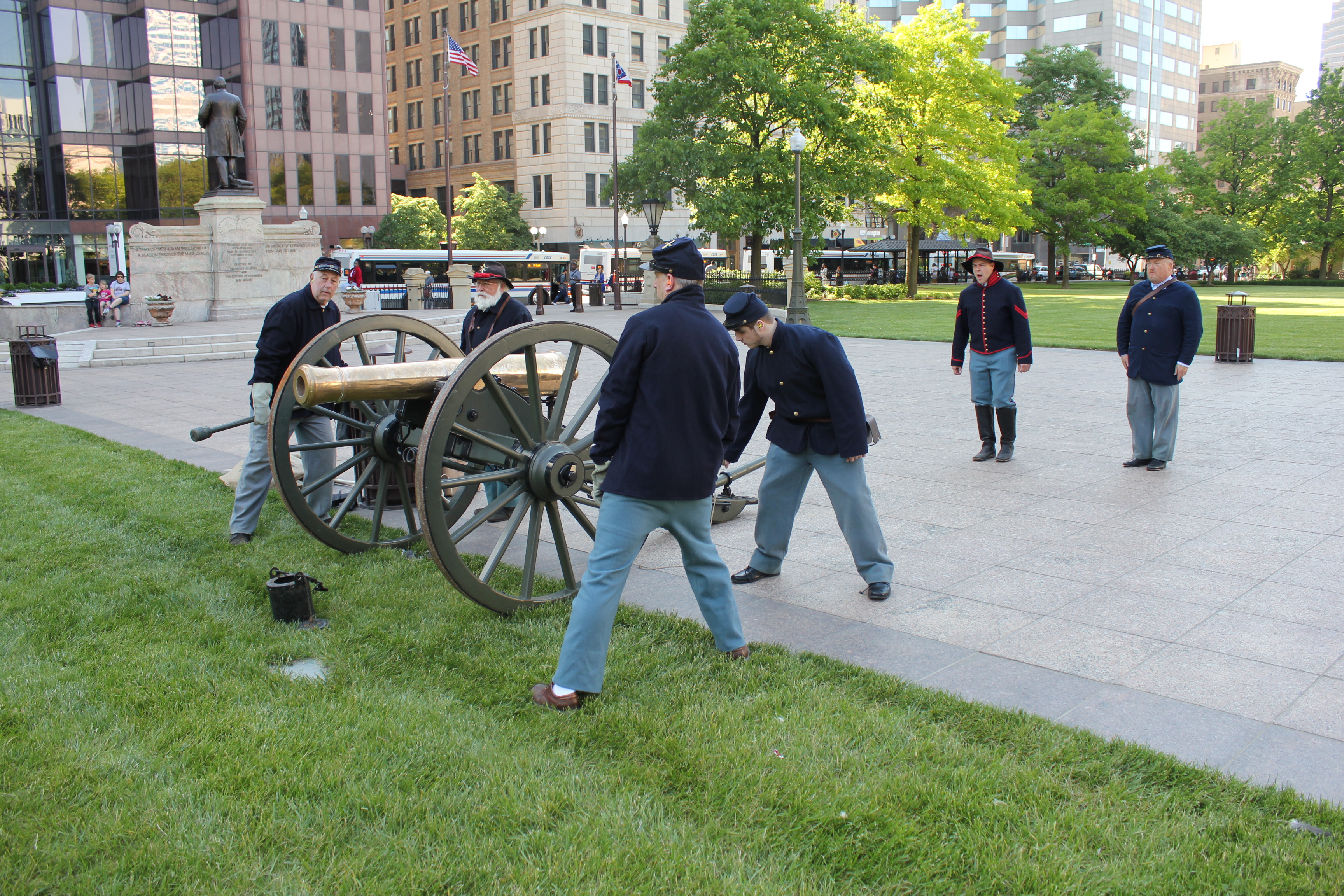 A vintage base ball game was played on the Ohio Statehouse lawn May 24, 2016. Capitol Cannons vs. Ohio Village Muffins for the Richard Schuricht Cup. The Capitol Cannons is made up of members of the Ohio General Assembly, Ohio senators and representatives. Vintage equipment displayed by Tracy Martin. Pennant table by Ohio Statehouse Museum Education Center. Concessions by Paddy Wagon and Milo's Capitol Cafe. Cannon firing by 1st Ohio Light Artillery, Battery A. National Anthem by Lindsey Brigano, Ohio Senate staff.