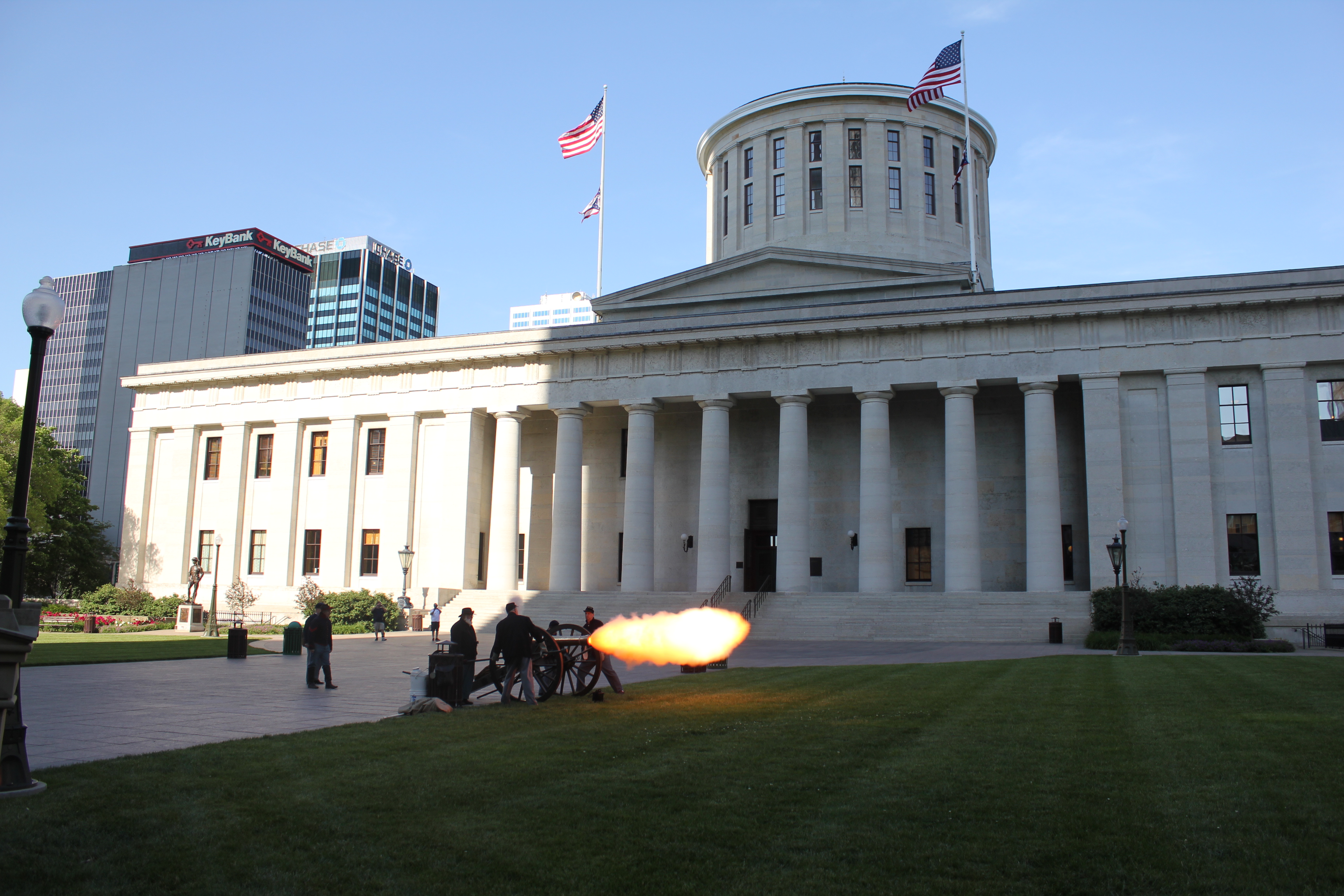 A vintage base ball game was played on the Ohio Statehouse lawn May 24, 2016. Capitol Cannons vs. Ohio Village Muffins for the Richard Schuricht Cup. The Capitol Cannons is made up of members of the Ohio General Assembly, Ohio senators and representatives. Vintage equipment displayed by Tracy Martin. Pennant table by Ohio Statehouse Museum Education Center. Concessions by Paddy Wagon and Milo's Capitol Cafe. Cannon firing by 1st Ohio Light Artillery, Battery A. National Anthem by Lindsey Brigano, Ohio Senate staff.