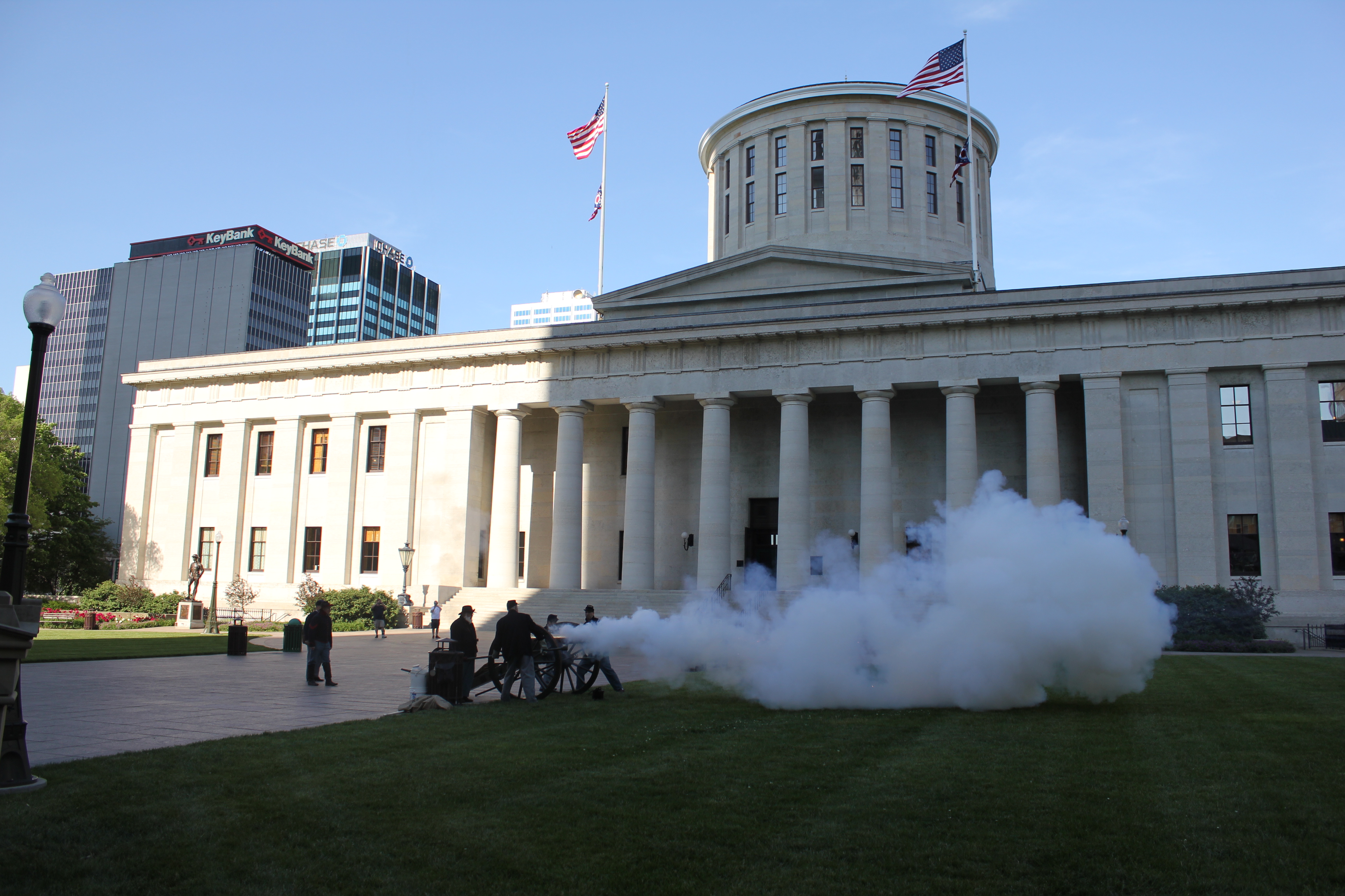A vintage base ball game was played on the Ohio Statehouse lawn May 24, 2016. Capitol Cannons vs. Ohio Village Muffins for the Richard Schuricht Cup. The Capitol Cannons is made up of members of the Ohio General Assembly, Ohio senators and representatives. Vintage equipment displayed by Tracy Martin. Pennant table by Ohio Statehouse Museum Education Center. Concessions by Paddy Wagon and Milo's Capitol Cafe. Cannon firing by 1st Ohio Light Artillery, Battery A. National Anthem by Lindsey Brigano, Ohio Senate staff.