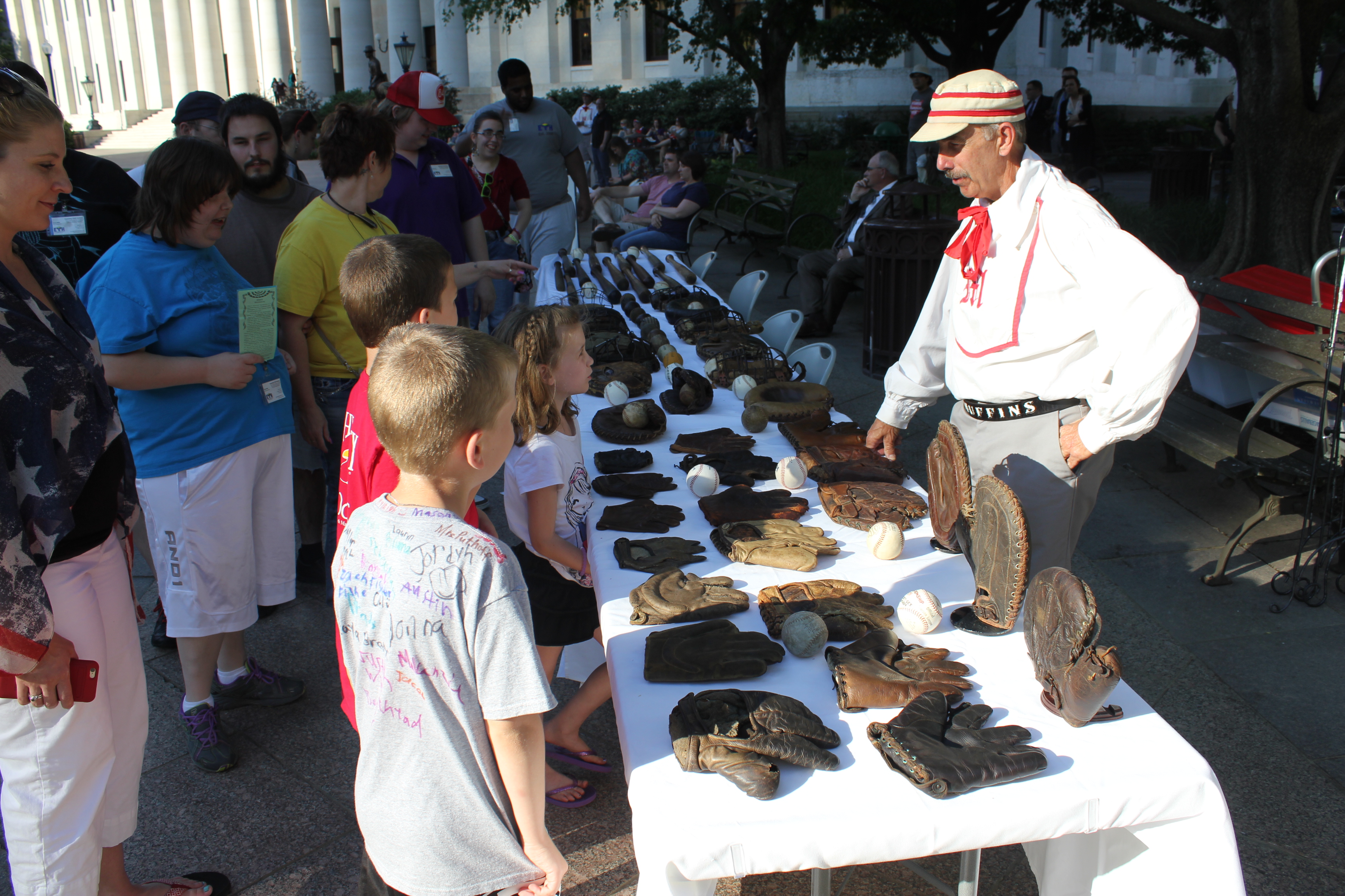 A vintage base ball game was played on the Ohio Statehouse lawn May 24, 2016. Capitol Cannons vs. Ohio Village Muffins for the Richard Schuricht Cup. The Capitol Cannons is made up of members of the Ohio General Assembly, Ohio senators and representatives. Vintage equipment displayed by Tracy Martin. Pennant table by Ohio Statehouse Museum Education Center. Concessions by Paddy Wagon and Milo's Capitol Cafe. Cannon firing by 1st Ohio Light Artillery, Battery A. National Anthem by Lindsey Brigano, Ohio Senate staff.