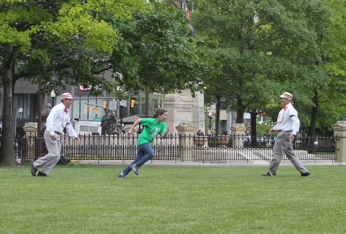 A vintage base ball game was played on the Ohio Statehouse lawn May 19, 2015. Capitol Cannons vs. Ohio Village Muffins for the Richard Schuricht Cup. Sponsored by the Ohio Lobbying Association (Kurt Leib, president) and Capitol Square Reveiw and Advisory Board (William Carleton, exec. director). Thanks to Ohio Village Singers for the national anthem, and to 1st Ohio Light Artillery, Battery A for the cannon firing. Concessions were by Milo's Capitol Cafe and the Angry Wiener Food Truck. Tracy Martin displayed his collection of vintage base ball items. Announcers were Andy Chow, Ohio Public Radio; Vince Tornero, Muffins and Robb Eshenbaugh, Ohio Lobbying Assn.