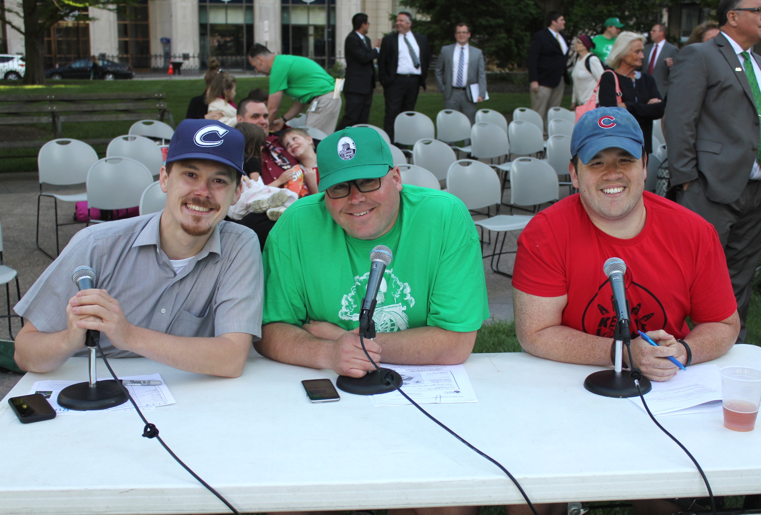 A vintage base ball game was played on the Ohio Statehouse lawn May 19, 2015. Capitol Cannons vs. Ohio Village Muffins for the Richard Schuricht Cup. Sponsored by the Ohio Lobbying Association (Kurt Leib, president) and Capitol Square Reveiw and Advisory Board (William Carleton, exec. director). Thanks to Ohio Village Singers for the national anthem, and to 1st Ohio Light Artillery, Battery A for the cannon firing. Concessions were by Milo's Capitol Cafe and the Angry Wiener Food Truck. Tracy Martin displayed his collection of vintage base ball items. Announcers were Andy Chow, Ohio Public Radio; Vince Tornero, Muffins and Robb Eshenbaugh, Ohio Lobbying Assn.