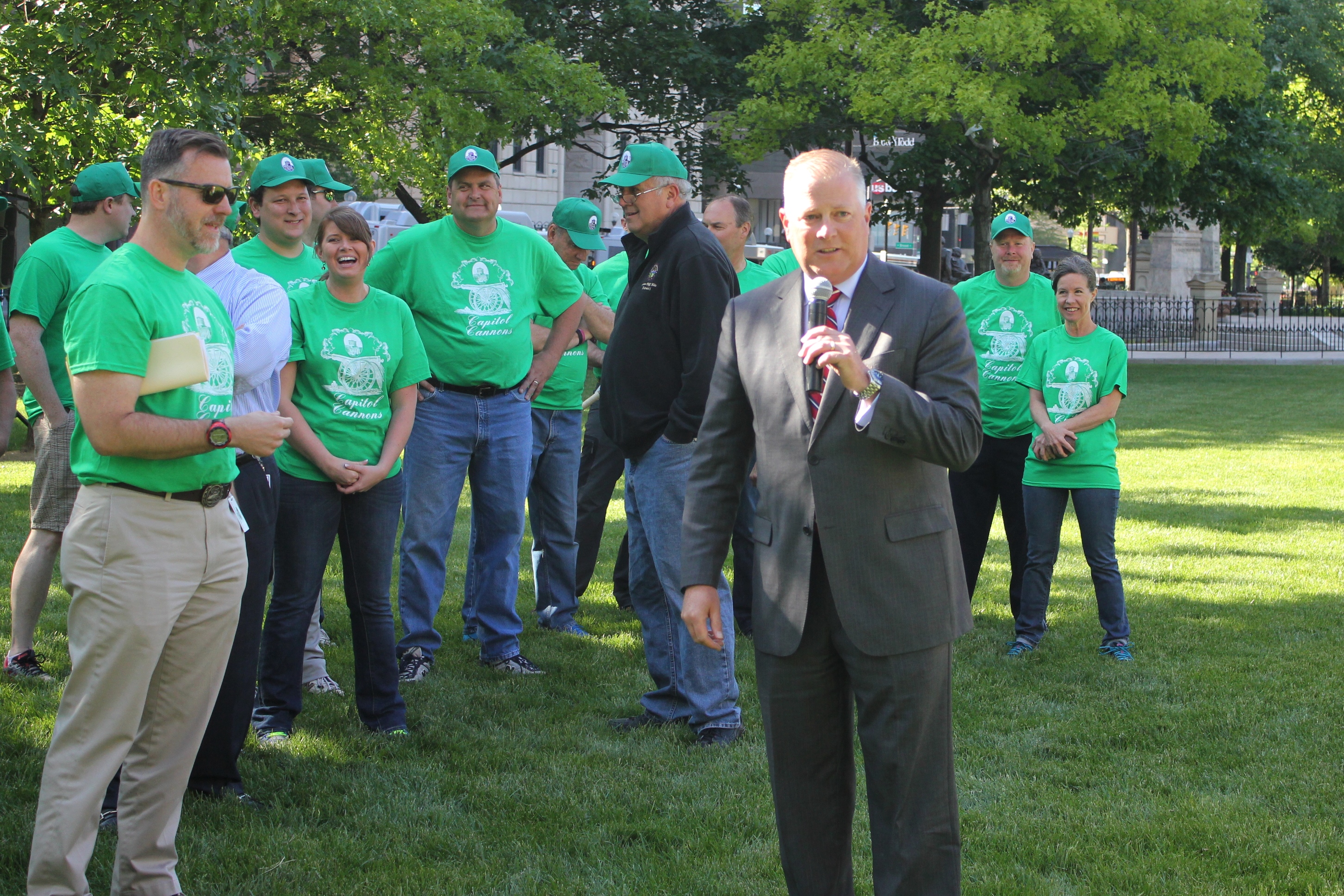 A vintage base ball game was played on the Ohio Statehouse lawn May 19, 2015. Capitol Cannons vs. Ohio Village Muffins for the Richard Schuricht Cup. Sponsored by the Ohio Lobbying Association (Kurt Leib, president) and Capitol Square Reveiw and Advisory Board (William Carleton, exec. director). Thanks to Ohio Village Singers for the national anthem, and to 1st Ohio Light Artillery, Battery A for the cannon firing. Concessions were by Milo's Capitol Cafe and the Angry Wiener Food Truck. Tracy Martin displayed his collection of vintage base ball items. Announcers were Andy Chow, Ohio Public Radio; Vince Tornero, Muffins and Robb Eshenbaugh, Ohio Lobbying Assn. First pitch was by Ohio Senate President Keith Faber.
